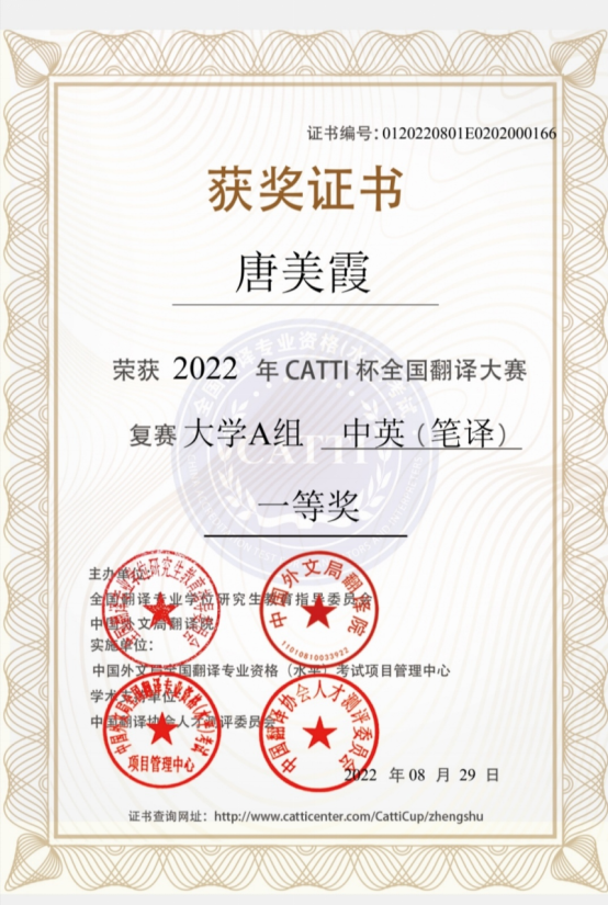 近日,“CATTI杯”全国翻译大赛圆满落幕。best365官网外国语学院唐美霞同学获大学A组中英(笔译)全国复赛一等奖,陈思宇同学获大学A组中英(笔译)全国复赛三等奖。
