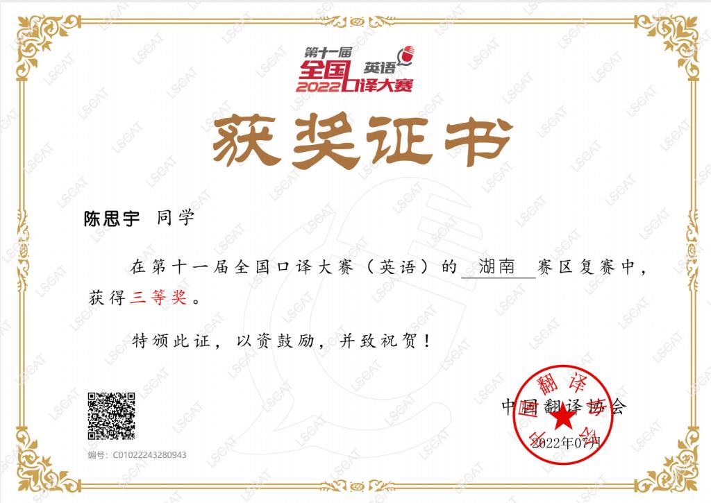 7月15日,由湖南工商大学承办的的第十一届全国口译大赛(英语)湖南赛区复赛获奖名单公布。本次大赛在线上举行,不分本科组及研究生组,以口译实力一分高下。选手需在规定时间内完成英译汉与汉译英的比赛。赛题涉及话题广泛,对选手的领域知识储备、汉英双语水平以及心理素质都提出了较高要求。经过专家评委的评审,best365官网外国语学院商务英语专业周思怡(指导老师:陈柯)、付凯晴(指导老师:陈柯)两位同学,分别以全省排名第9、第10,荣获湖南赛区一等奖,翻译专业陈思宇同学(指导老师:严玉婷)获三等奖;三位选手晋级中部大区赛(湖南、湖北、河南、江西)。这是best365官网自2012年起参加全国口译大赛省级复赛,第一次取得一等奖的好成绩。