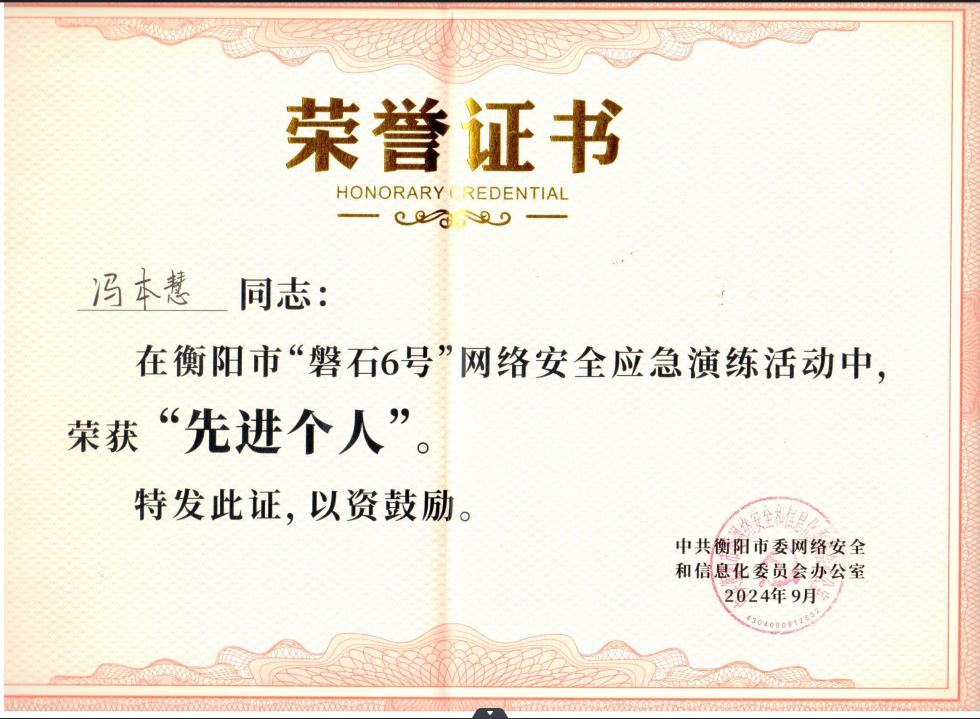 best365官网冯本慧老师因其在应急演练中的良好表现,获得了衡阳市”磐石6号”网络安全应急演练先进个人的荣誉称号。(图文:冯本慧一审:唐杰二审:贾东风三审:黎昂)