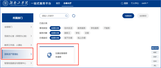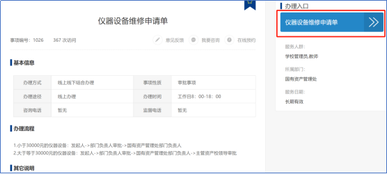 ① 申请:申请人按照上面的步骤登录一网通办服务平台后,如下图,点击左侧“国有资产管理处”,再点击右侧“仪器设备维修申请单”