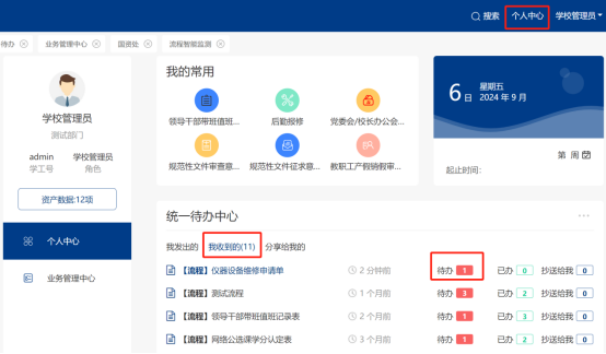 ② 审批:审批人员按照第一步骤登录系统后,右上角点击“个人中心”,在“我收到的”中找到对应的流程(仪器设备维修申请单),点击“待办”后的数字,即可进去需要审批的申请单列表中。