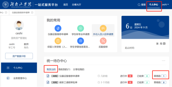 申请人可点击系统右上角的“个人中心”->“我发出的”,可以查看自己填写过或者提交过的申请单,其中[进行中]表示已提交,但还没有审批结束,[已结束]表示已审批完成的,[草稿箱]表示在上一步填写后没有提交,保存至草稿箱的单子。