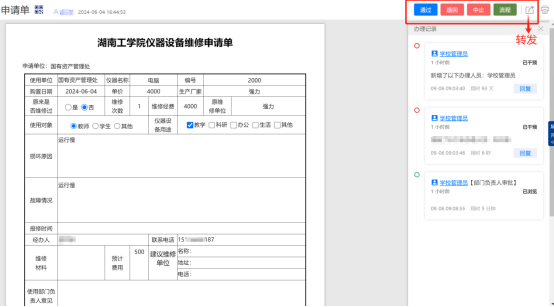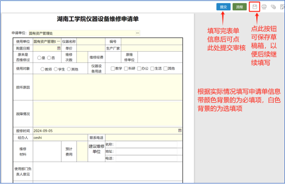 3、业务办理(申请及审批)以“仪器设备维修申请单”为例: