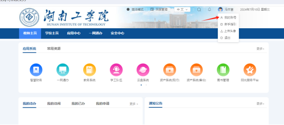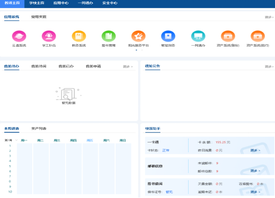 登录成功后进入个人门户首页,可访问一网通办、智慧财务、教务系统、资产系统、学工系统、云盘系统、个人邮箱等各业务系统,查看个人课表、个人资产等相关信息,如下图所示。