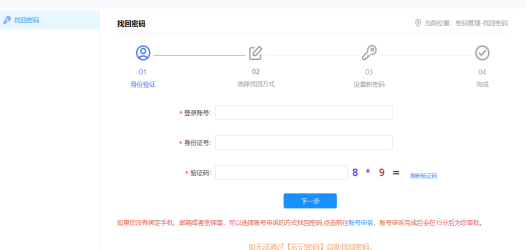 提示:密码找回功能需已绑定手机号码或邮箱或密保等信息,如没有绑定以上信息可前往账号申诉,通过申诉找回密码(参照步骤五账号申诉)。