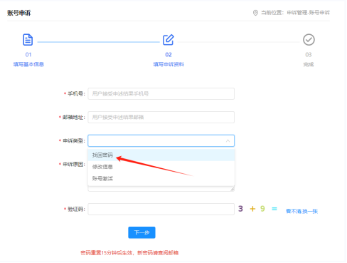 (四)填写申诉资料,在申诉类型选择“找回密码”,提交后15分钟内可通过邮件查看新密码,重新登陆后建议修改密码,如下图所示。