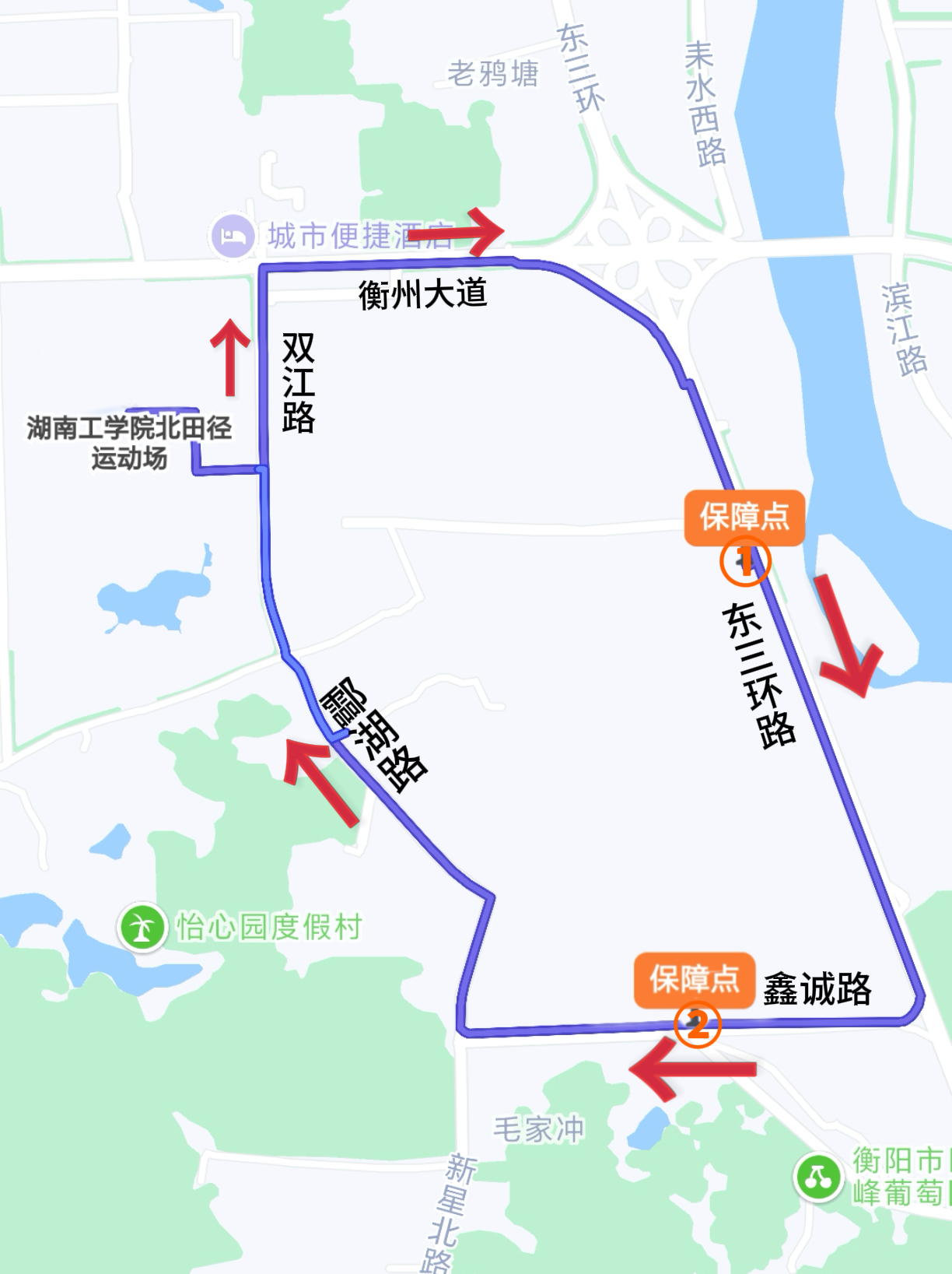 北操南门→至善路→知行大道→学校东门→双江路→衡州大道→东三环辅路→东三环路→鑫诚路→酃湖路→双江路→学校东门→知行大道→求实路→北操北门,全程8公里。