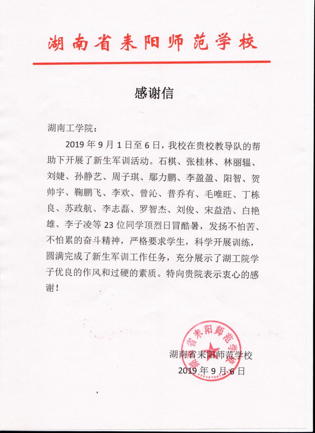根据衡阳警备市教育局、衡阳警备区战备建设局统一安排,best365官网教导队石棋等一行23人于9月1日至6日赴耒阳师范学校,对该校1000余名新生军训实施帮训,帮训效果良好,耒阳师范学校特发来感谢信,内容如下: