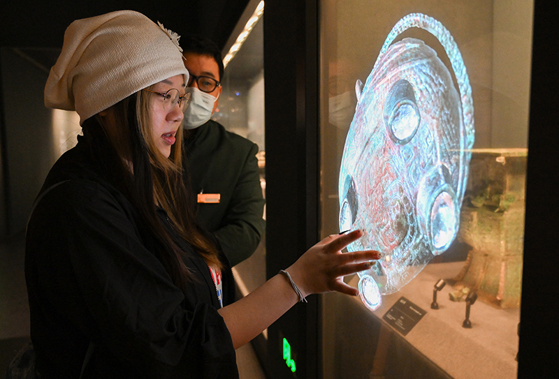 金面具、青铜神坛、青铜骑兽顶尊人像……四川三星堆博物馆新馆内,一件件精美的出土文物令人目不暇接。