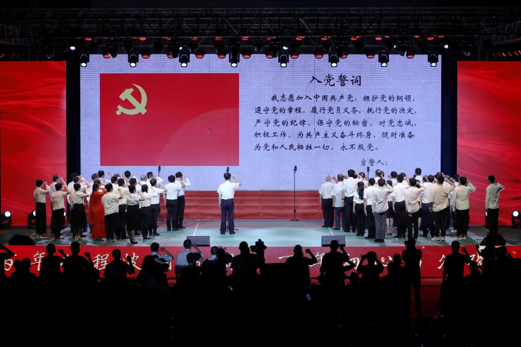 晚会中,由党委书记宋克慧领誓,学校光荣在党50年老党员代表、校友党员代表、教职工、学生党员代表与全场预备党员、党员一起共同重温了入党誓词,铿锵有力的宣誓声,将晚会推向高潮。