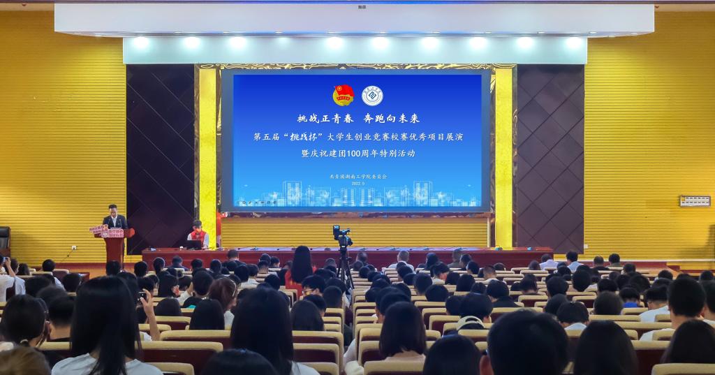 活动在慷慨激昂地齐唱国歌中拉开序幕。与会师生现场观摩了第五届“挑战杯”大学生创业竞赛校赛优秀项目展演。经过层层选拔、反复打磨,11个项目从报备校赛的66份作品中脱颖而出。他们或关注太阳能光热转换,研发新型介质,致力科技创新与未来产业;或关注家乡艾草、山笋等惠农扶贫产业,投身乡村振兴与脱贫攻坚;或关注厨余垃圾废油处理、水污染处理技术,致力生态环保和可持续发展;或关注教育“双减”、大学生就业、舒心出行等民生福祉,投身城市治理和社会服务。