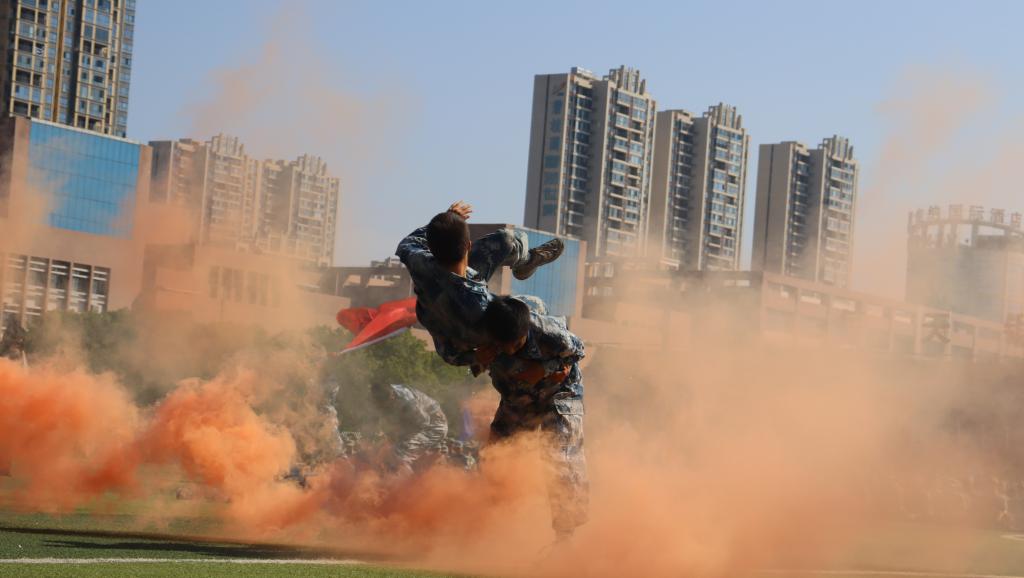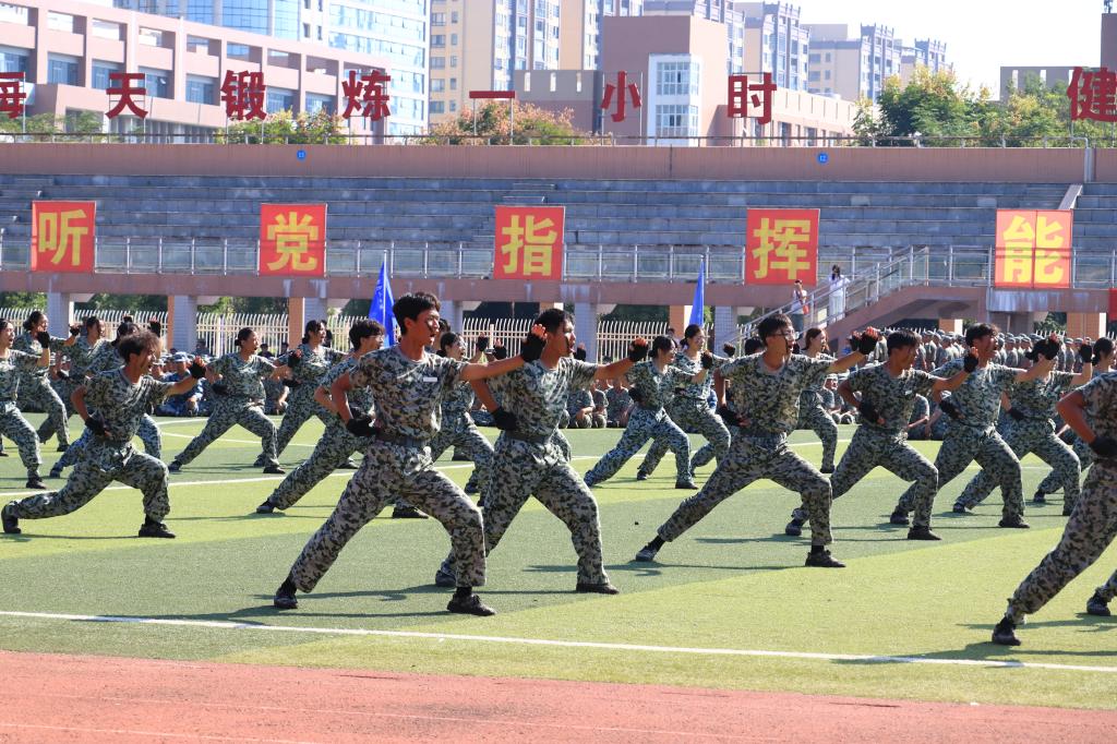课目表演环节精彩纷呈。擒敌拳方阵以矫健的动作登场,拳风劲烈、气势如虹,每一招一式都透露着坚定的力量与过硬的技能;枪操表演队列整齐、动作精准,展示了完美的团队配合与作战智慧;匕首操方阵则以凌厉的动作诠释了刚强与不屈,充分展现了军训带来的意志力和纪律性。模拟战场上,战术方阵的学员们迅猛出击,精准执行任务,展示出卓越的军事技能与团队协作能力。战场救护环节中,学员们迅速而有序地进行伤员救护操作,充分体现了对生命的尊重与保护。