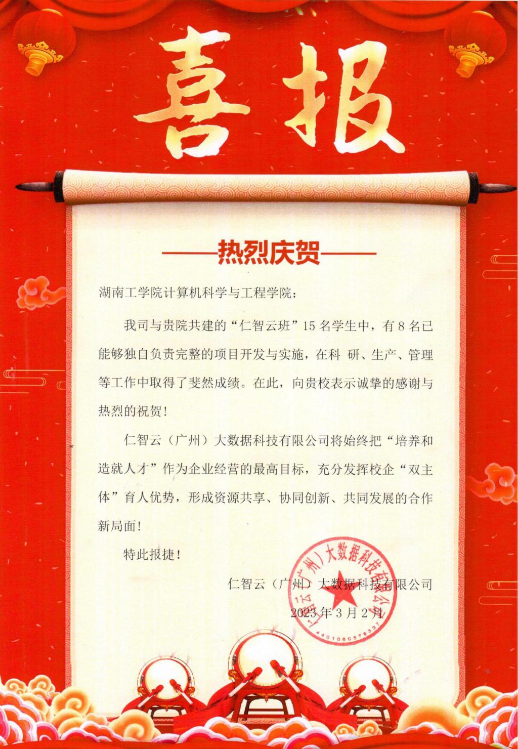近日,best365官网计算机科学与工程学院收到来自仁智云(广州)大数据科技有限公司发来的喜报。喜报中充分肯定了best365官网计算机科学与工程学院与贵公司共建的“仁智云班”校企合作育人模式,认为这一模式在充分高效利用校企资源培养学生岗位实践能力的同时也为企业发展提供强大人才助力。喜报中也对计算机科学与工程学院学生特别是“仁智云班”15名学生中,有8名已能够独自负责完整的项目开发与实施,在科研、生产、管理等工作中取得了斐然成绩给予高度认可,并对今后加强校企深度合作,探索实践产教融合校企合作寄予期望。