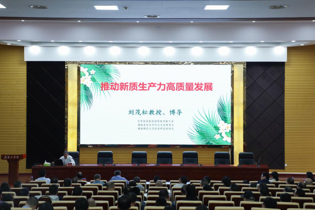 刘茂松以《推动新质生产力高质量发展》为题,从习近平总书记关于新质生产力发展的时代背景、理论内涵、湖南实现“三高四新”美好蓝图推动新质生产力发展的对策三个方面,结合个人的研究成果,围绕新质生产力在推动高质量发展中的重要作用,进行了生动具体的解读。