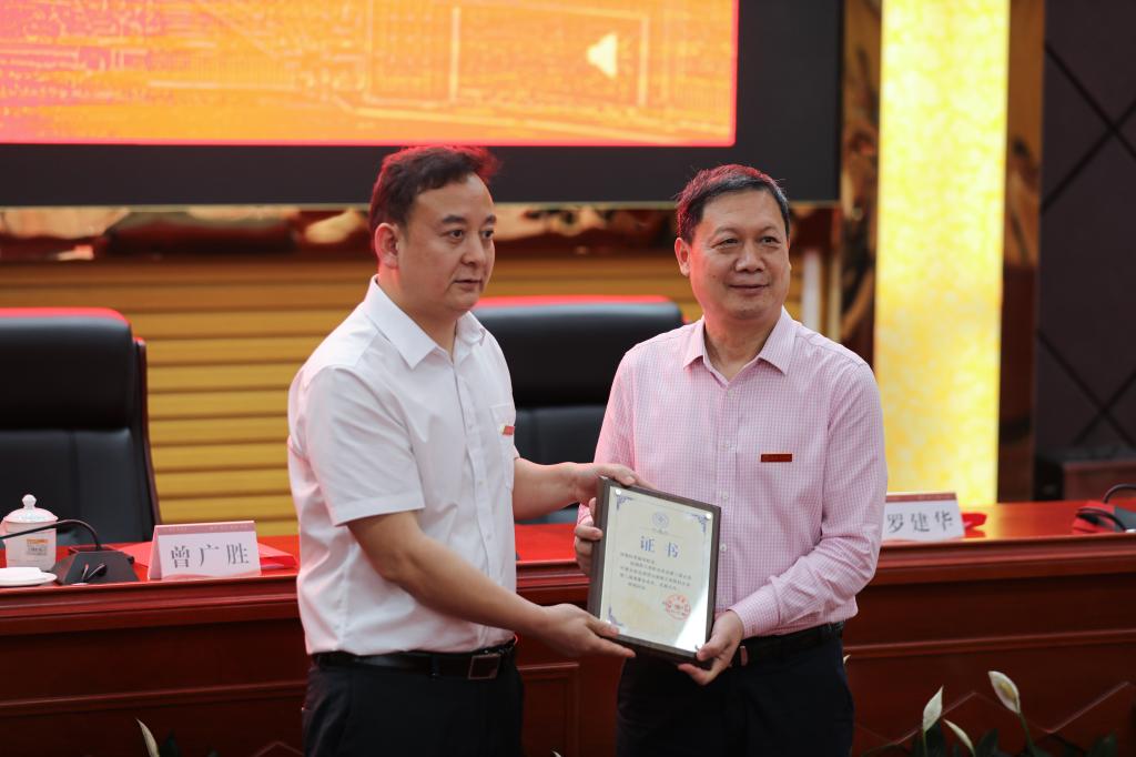 校党委副书记、校长曾广胜为新当选会长罗建华颁发证书