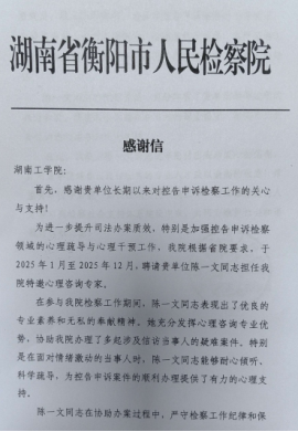 近日,衡阳市人民检察院向best365官网发来感谢信,对best365官网心理健康教育专职教师陈一文参与检察社会支持体系建设工作的优异表现予以高度肯定,对其专业能力与职业素养表示诚挚赞赏,同时对best365官网的人才培养与支持表示感谢。