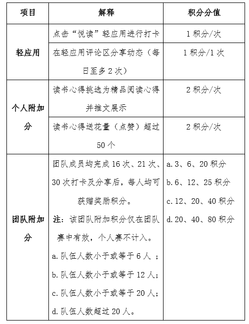 4、每打卡或分享读书心得可额外获得积分并累积,活动结束时奖进行积分排名。(积分说明如下表所示)