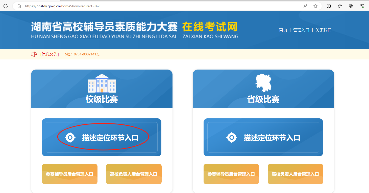 (一)班情熟知环节模拟测试。学生工作部将于11月15日12点至11月19日12点开放“湖南省高校辅导员素质能力大赛在线考试网(校级比赛)”班情熟知环节模拟考试权限,以供参赛选手练习使用。