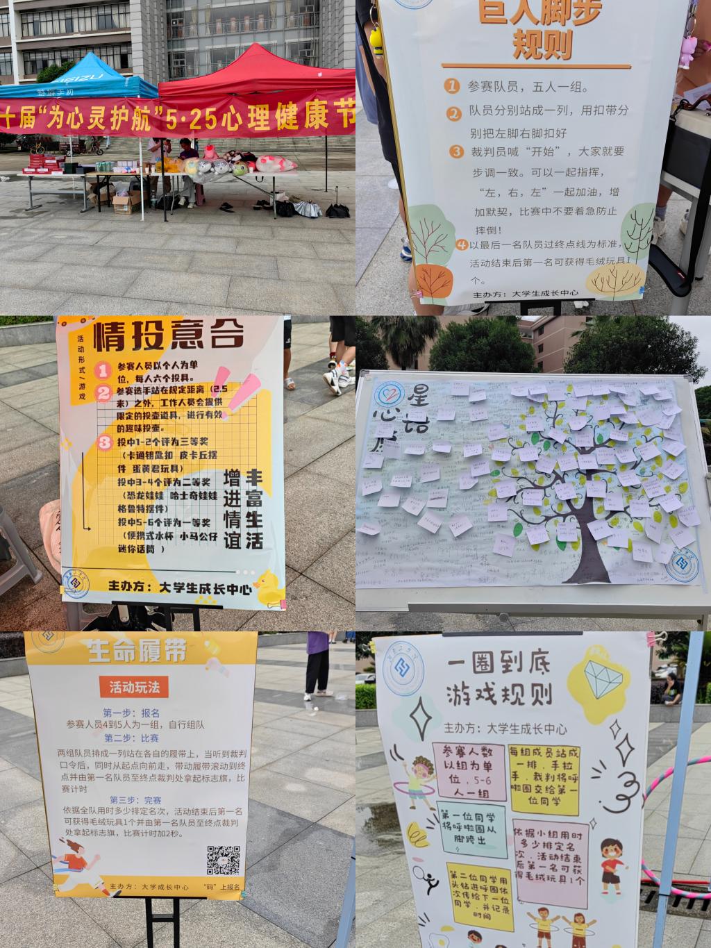活动主要包括巨人脚步、趣味一掷、一圈到底、情投意合、生命履带等趣味性项目。丰富多彩,妙趣横生的活动吸引了众多同学们的目光,同学们流连于此,踏上一场寻找自我的浪漫奇幻之旅,整个广场充满着同学们的欢声笑语。多姿多彩、扣人心弦的游戏项目,为同学们在紧张的学习、生活之余带来了轻松与快乐,帮助同学们掌握心理健康知识,学会正确认识自我、悦纳自我,以理性、平和、积极的心态拥抱美好生活。