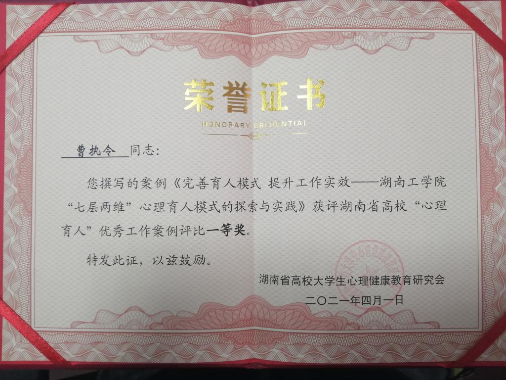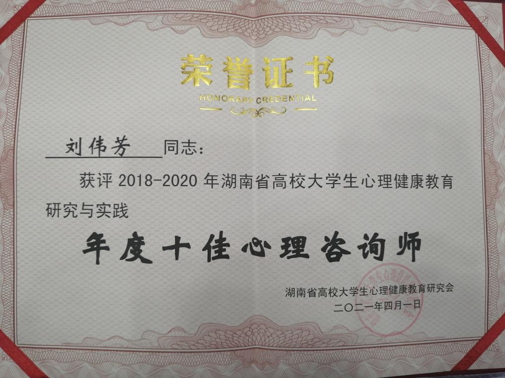 2021年4月1日,湖南省高校大学生心理健康教育研究会第十二次年会暨湖南省高校大学生心理健康教育工作专业化推进会在长沙理工大学召开,来自全省高校的学生工作部部长及心理中心主任参会,中共湖南省委教育工委委员徐伟出席大会并讲话。会上表彰了一批大学生心理健康教育工作先进集体优秀个人“心理育人”优秀工作案例其中,best365官网曹执令校长撰写的《完善育人模式 提升工作实效——best365唯一官方网站“七层两维”心理育人模式的探索与实践》获评湖南省高校“心理育人”优秀工作案例一等奖,心理健康教育与咨询中心刘伟芳老师荣获湖南省高校大学生心理健康教育研究与实践“十佳心理咨询师”称号。