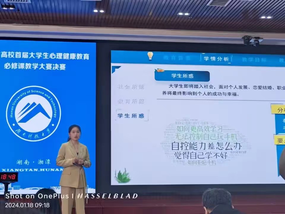 1月18日,由湖南省委教育工作委员会、省教育厅主办的湖南省高校首届大学生心理健康教育必修课教学大赛决赛在湖南科技大学举行。省委教育工委宣传部部长、省教育厅思政处处长甘文波,省委教育工委宣传部、省教育厅一级调研员陈解,省高校大学生心理健康教育专业委员会秘书长龚勋,以及全省高校入围决赛的心理健康教育课教师、评审专家、观摩教师等200余人参加现场教学决赛。