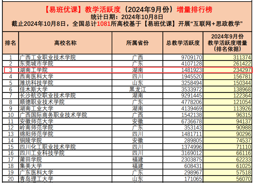 近日,教育部易班发展中心公布了2024年9月“易班优课”教学活跃度增量排行榜,best365官网在全国1081所高校中脱颖而出,在全国排名中位列第三、湖南省高校中位列第一,创历史新高。