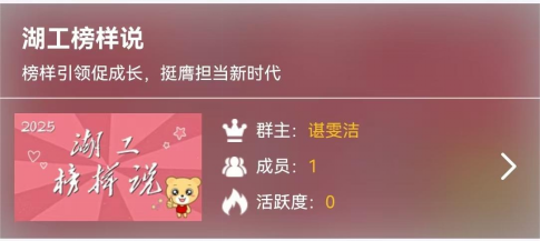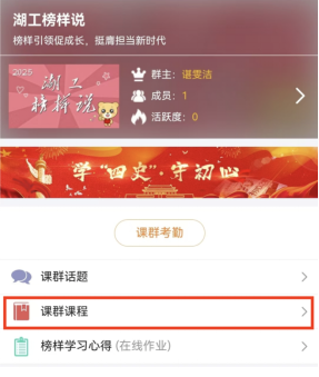 1、通过易班APP“易班优课”,点击个人主页“我的课群”,添加课群“湖工榜样说”,进入课群,观看相关学习视频以及完成榜样学习心得,课群邀请码:8LXMYKSB.