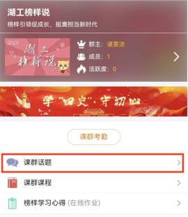 5、进入“湖工榜样说”课群首页后,点击“课群话题”,发起话题讨论。