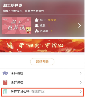 6、进入“湖工榜样说”课群首页后,点击“榜样学习心得(在线作业)”,发表心得(心得+微信推文点赞+微信视频号点赞)。