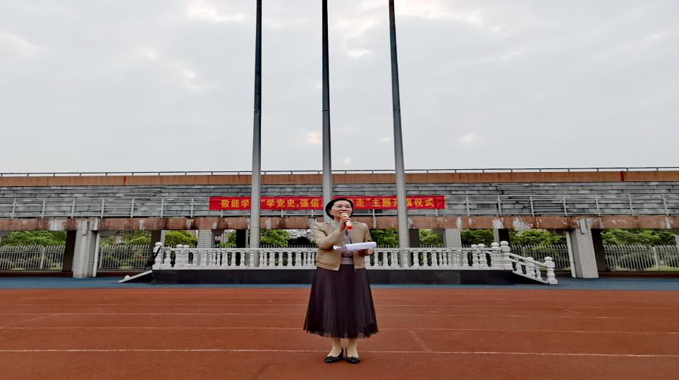 伴随着雄壮激昂的《义勇军进行曲》,五星红旗冉冉升起,全体师生注目行礼。学生代表黄馨仪同学在国旗下进行了《不忘初心跟党走》主题演讲,她带领大家回顾了党的光辉历程,号召同学们弘扬党的优良传统,用奋斗书写青春画卷。