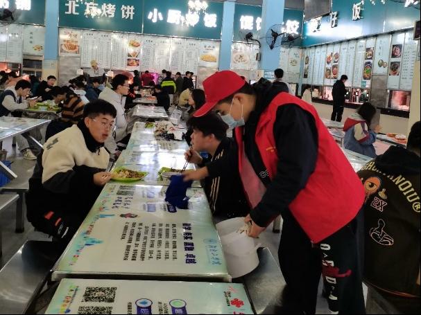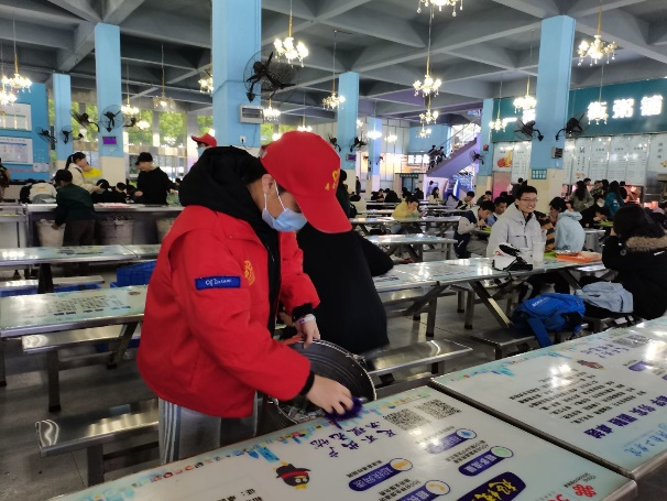志愿者在食堂门口提醒每一位同学、老师佩戴口罩,排队买饭时注意安全距离。打饭窗口前志愿者提醒大家实行光盘行动,避免粮食浪费、文明就餐。志愿者帮助食堂阿姨整理厨余垃圾,打扫餐桌卫生,维护良好的就餐环境。