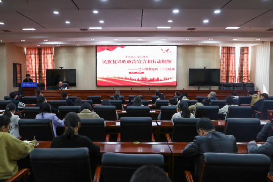 刘升学以“民族复兴的政治宣言和行动纲领”为题,从宣誓一个主题、展示伟大变革、高举伟大旗帜、明确中心任务、作出战略部署、找到第二答案、坚守底线思维七个方面,对党的二十大精神进行深入解读。