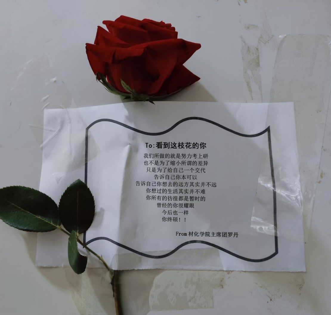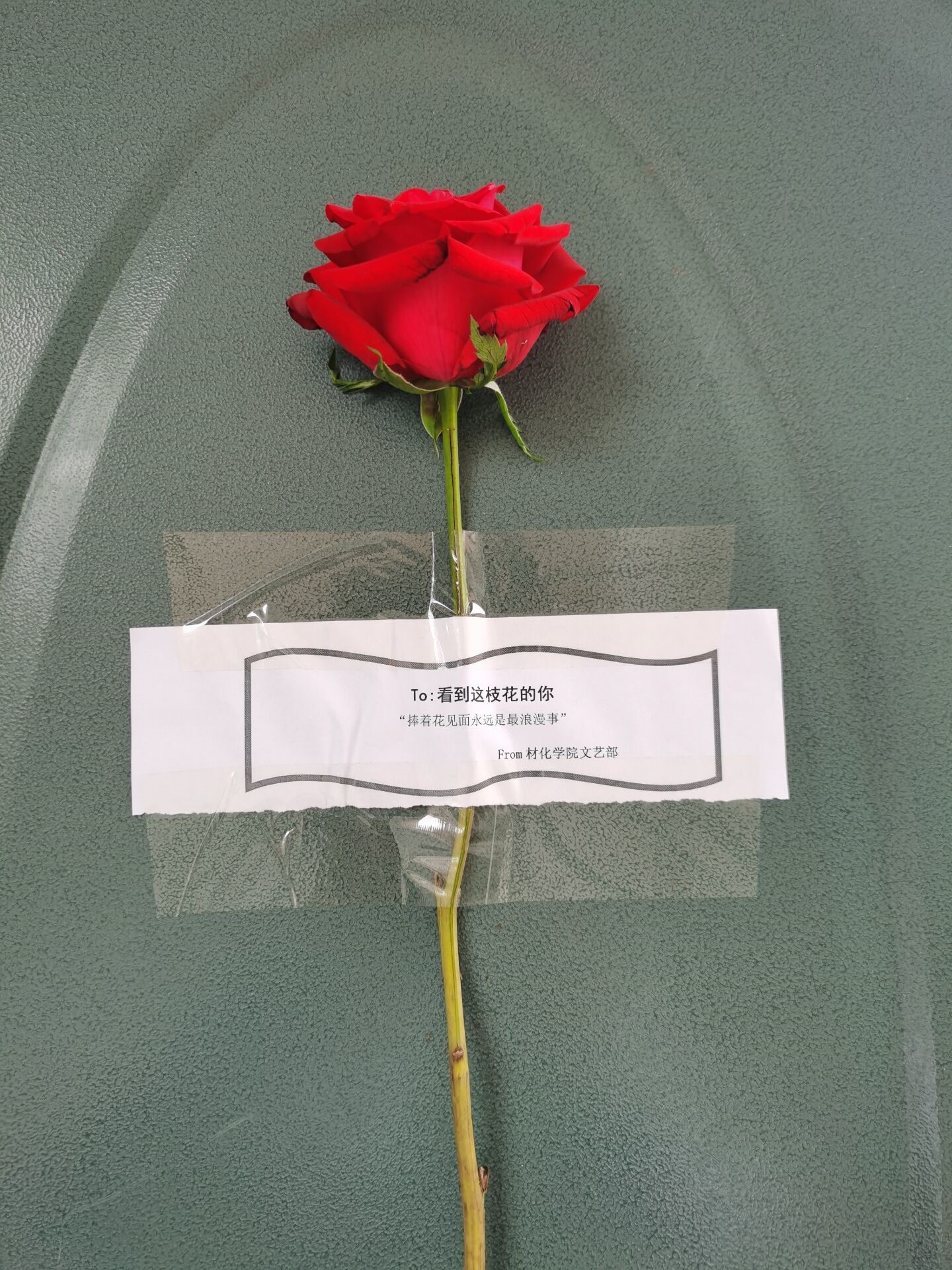 2021年05月20日至05月31日,材化学院团学会文艺部在材化楼一楼安排工作人员守候给学生免费发放玫瑰,让学生写下自己的祝福粘贴在玫瑰上,将玫瑰贴满材化楼。并且在大四宿舍楼下安置板报,让大四毕业生写下了自己想说的话,并将板报放置到材化楼一楼,让学弟学妹们将自己对毕业生们的祝福写在板报上。此次活动材化学院全体师生都加入其中,大家一起给毕业生们留祝福、赠寄语。