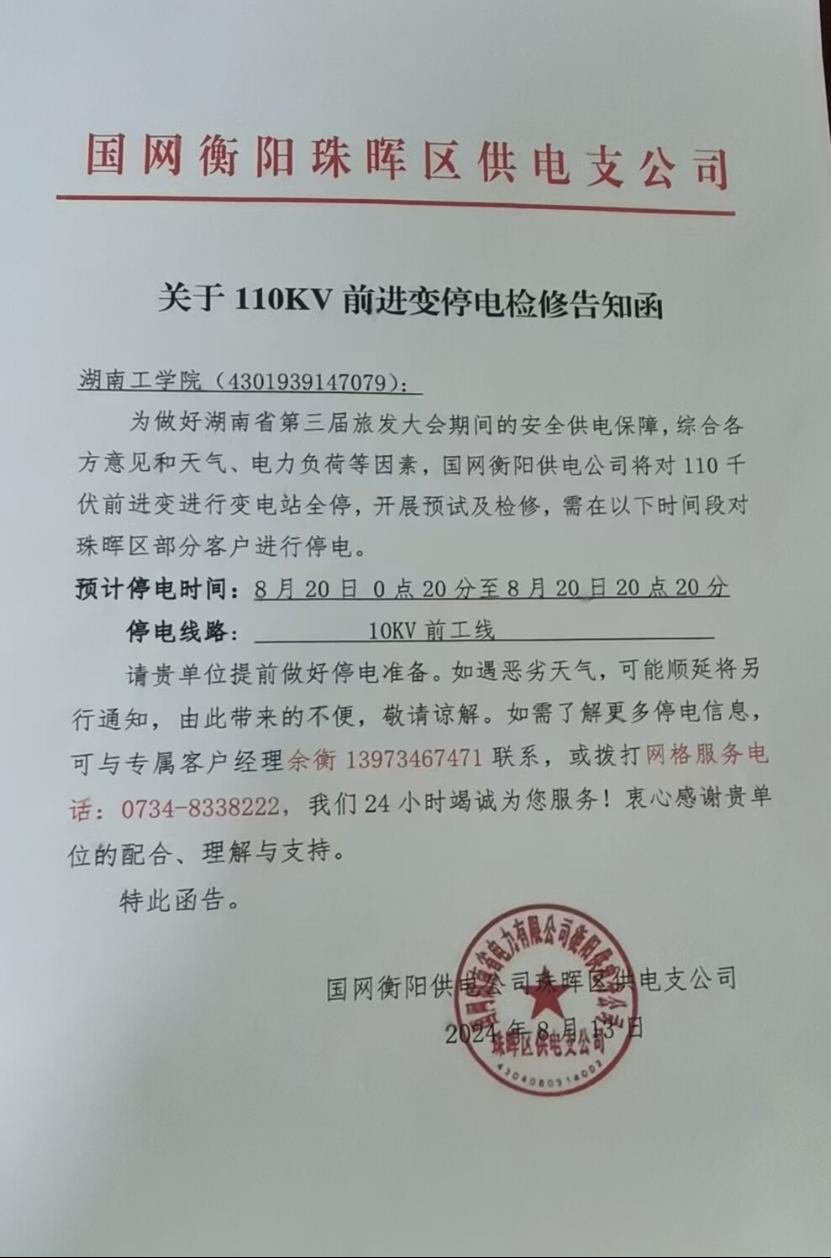 国网衡阳供电公司2024年8月20日0点20分-20点20分对前进变电站升级改造,best365官网前工线将停止供电,为保障学校正常用电,我处将同期进行倒闸操作,相应的停电时间及停电区域如下: