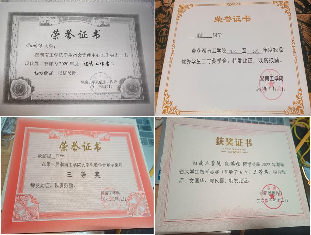 段鹏程,曾获得校级和省级数学竞赛三等奖,考取了英语四级证书。大学四年学习认真,尤其体现在其数学和专业课上面。大学期间他还多次积极参加各种志愿者活动,努力全面提升自己。