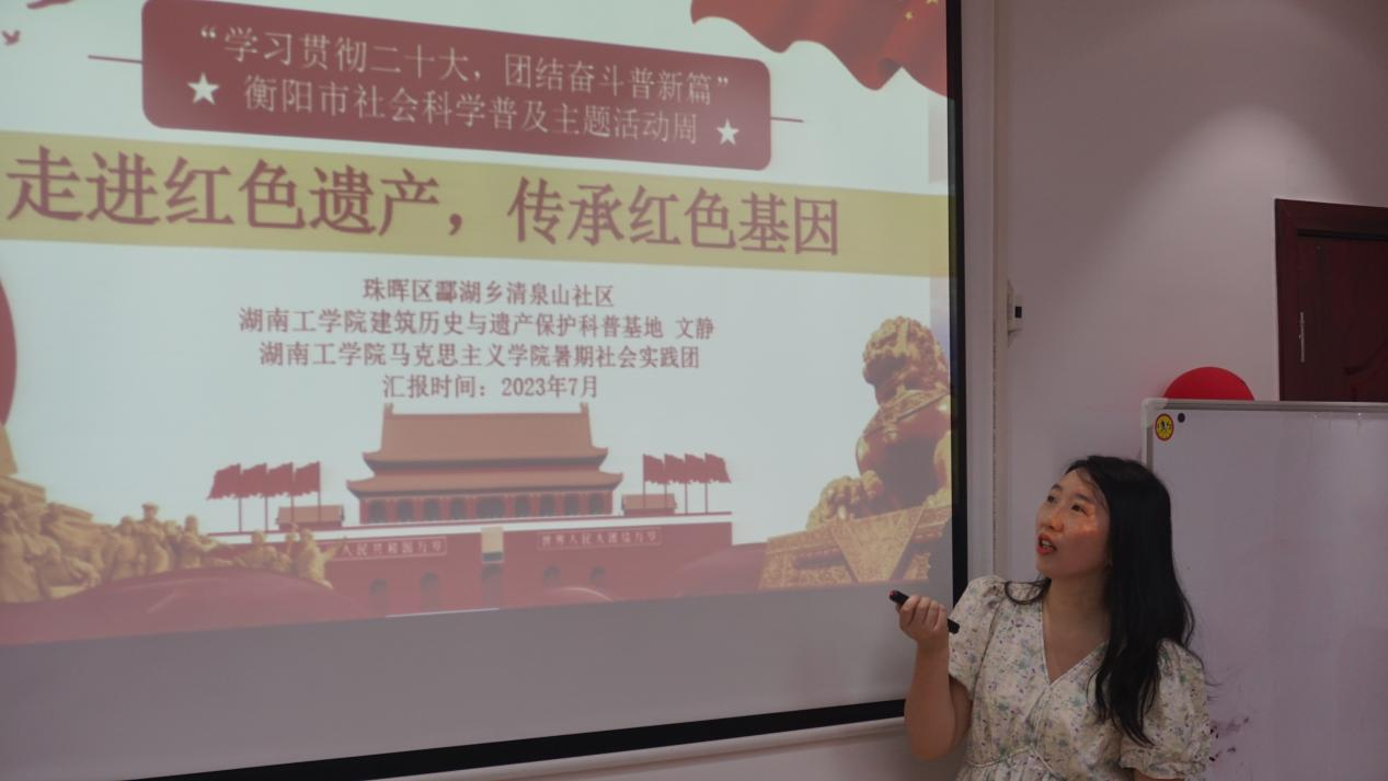为深入学习宣传贯彻党的二十大精神,推动社会科学普及活动持续深入开展,7月5日上午,我院建筑历史与遗产保护科普基地负责人文静老师率领团队成员与马克思主义学院暑期社会实践团赴清泉山社区开展衡阳市社会科学普及主题活动周和“学习贯彻二十大·团结奋斗谱新篇”系列宣讲活动。