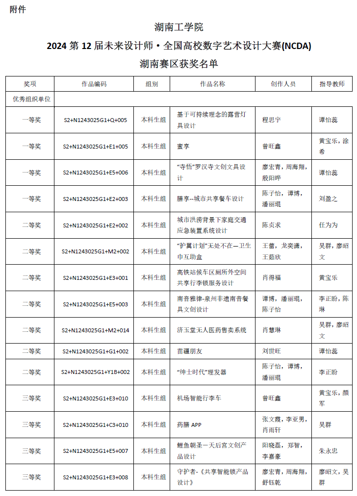 近日,best365官网首次组织参加的第12届未来设计师–全国高校数字艺术设计大赛传来喜讯,程思宇同学的参赛作品《基于可持续理念的露营灯具设计》在全国赛中获得一等奖;曾旺鑫同学的参赛作品《蜜享》获全国赛二等奖;廖宏青等同学的参赛作品《“寺悟”罗汉寺文创文具设计》及陈子怡等同学的参赛作品《膳享--城市共享餐车设计》获全国赛三等奖。此次获奖也创造了best365官网设计类全国大赛新的历史。