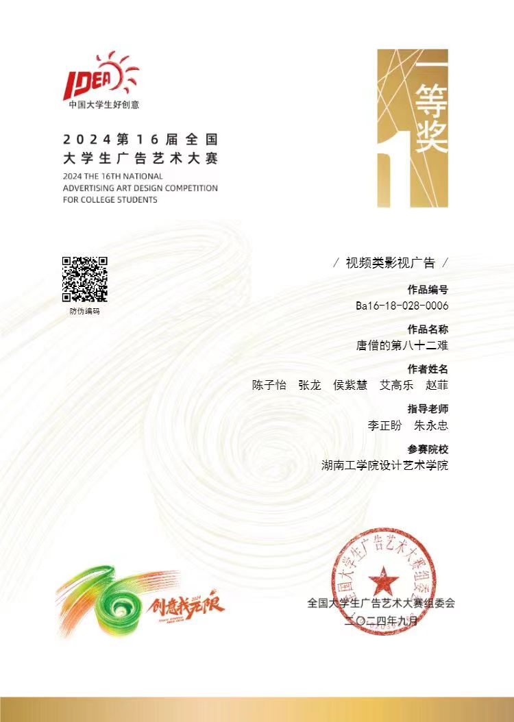 近日,第十六届全国大学生广告艺术大赛(以下简称:大广赛)国赛评审落下帷幕,best365官网设计艺术学院陈子怡、张龙、侯紫慧等同学提交的“唐僧的第八十二难”作品经过层层选拔,最终荣获一等奖,这是best365官网自参加大广赛以来的最佳成绩,大广赛是国家级A类学科竞赛赛事,是中国最大的高校广告艺术传播平台,由教育部高等教育司指导、教育部高等学校新闻传播学类专业教学指导委员会、中国高等教育学会广告教育专业委员会共同主办,中国传媒大学、全国大学生广告艺术大赛组委会承办的全国高校文科大赛。