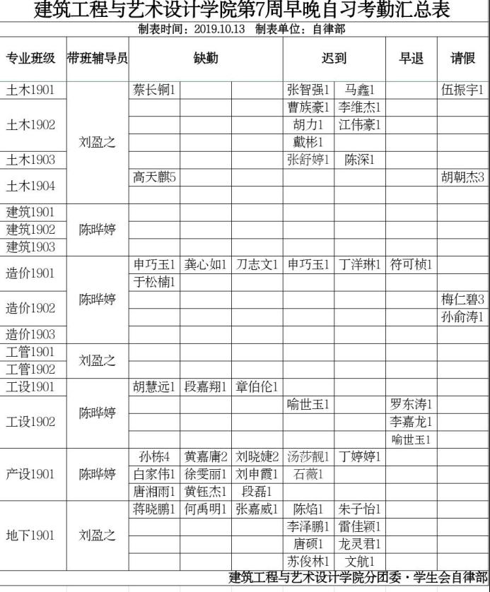 建筑工程与艺术设计学院第7周早晚自习考勤汇总表
