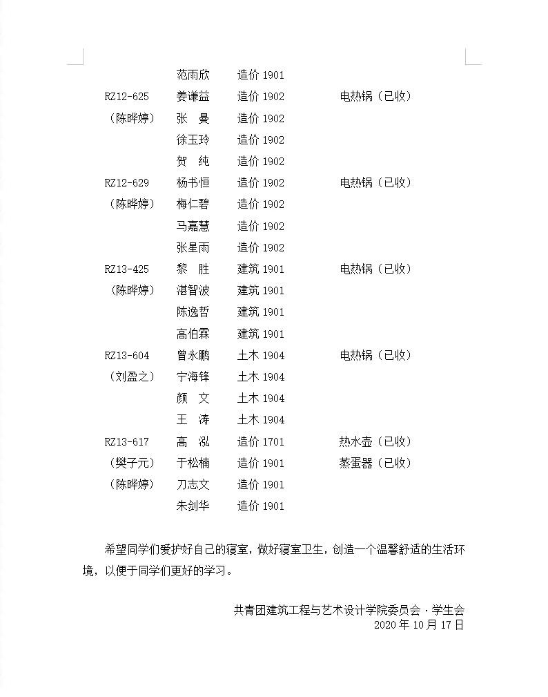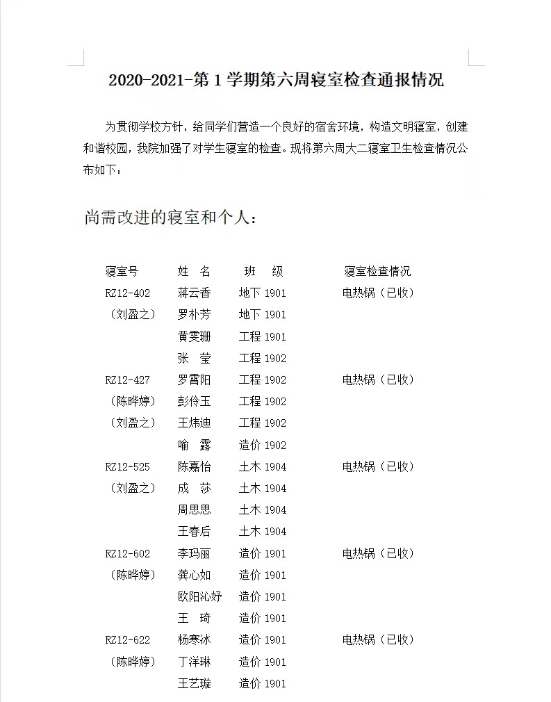 2020-2021-第1学期第六周寝室检查通报情况