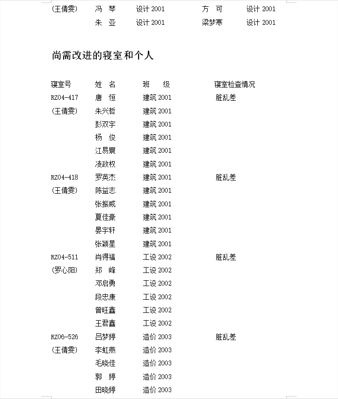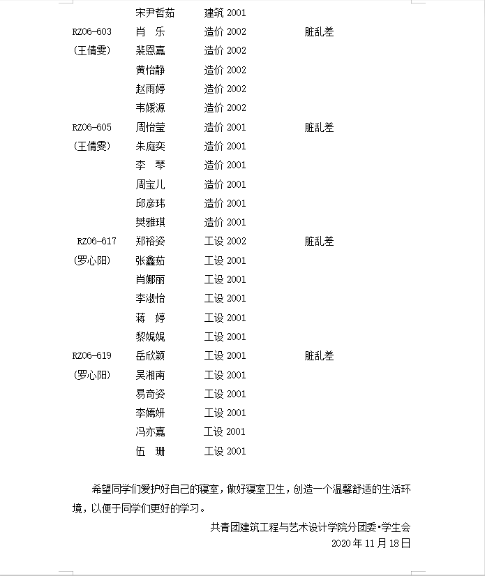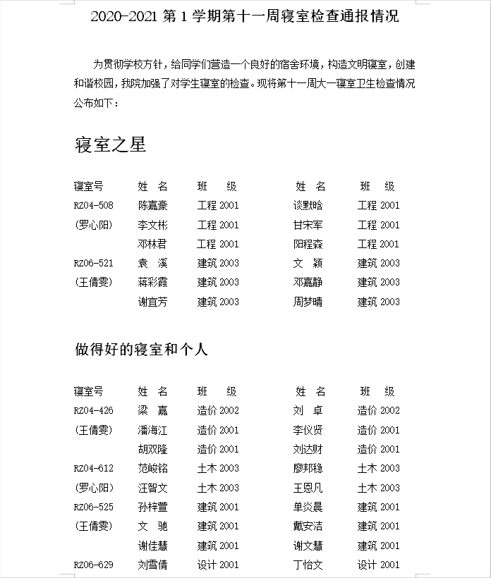 第十一周 20级寝室公示表
