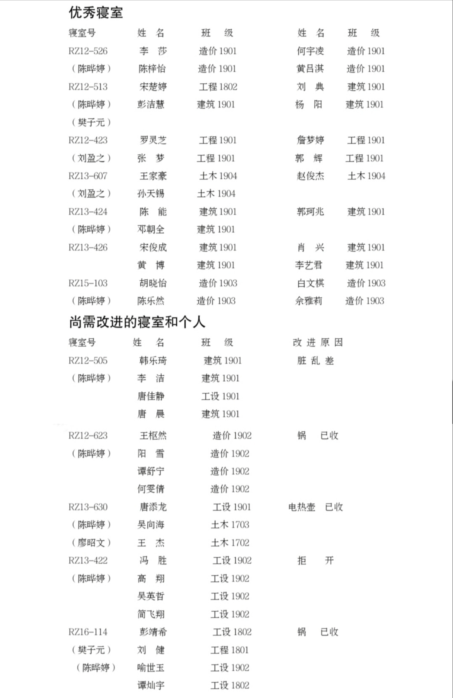为贯彻学校放针,给同学们营造一个良好的宿舍环境,我部门于本周日对建工学院大二寝室进行检查,现将本次查寝情况公示如下:
