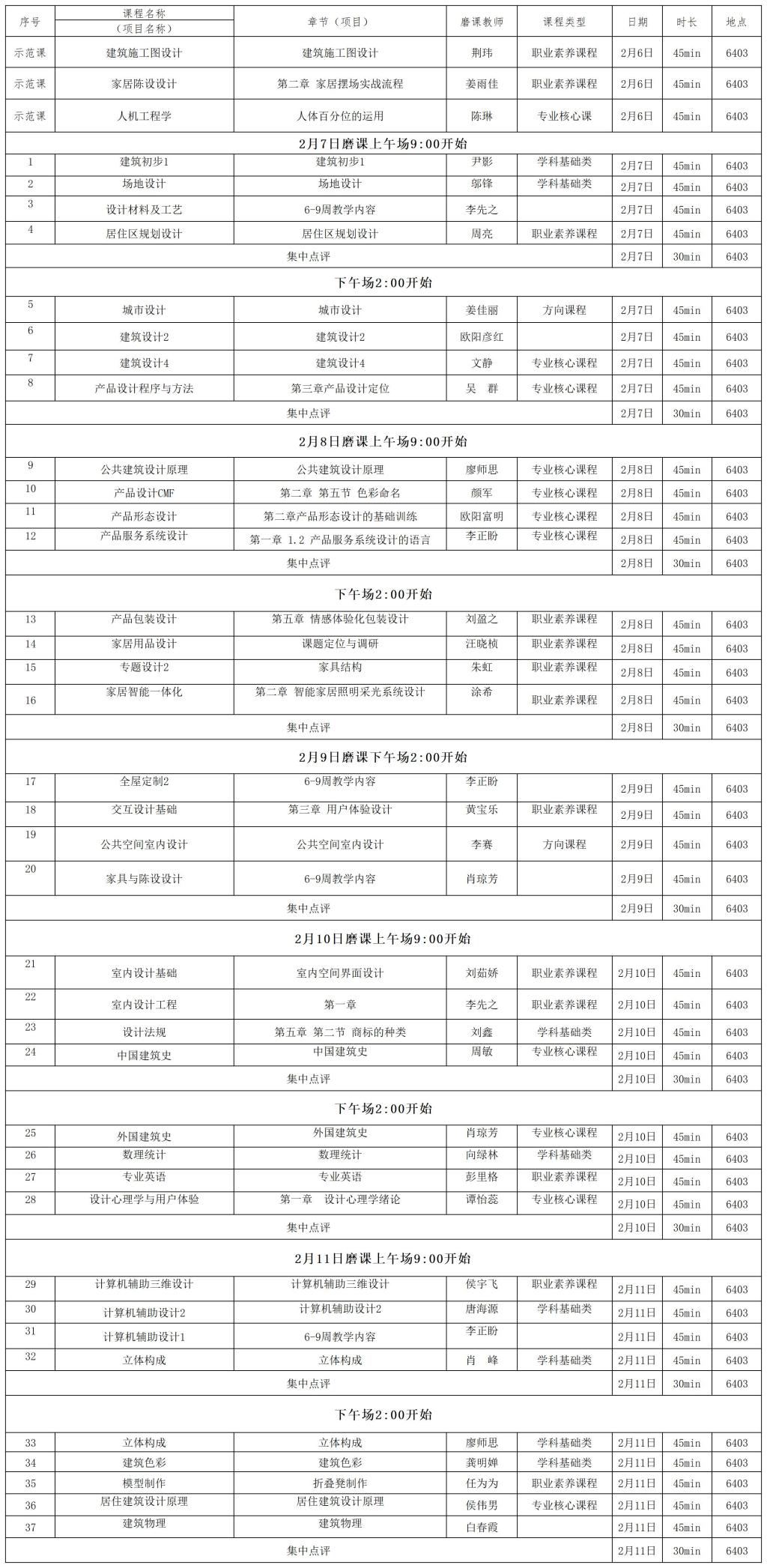 2023年2月6日至2023年2月11日磨课安排