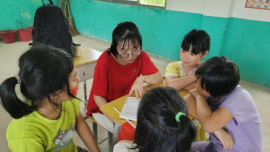 图3 指导老师和团队成员给小朋友讲解红色故事