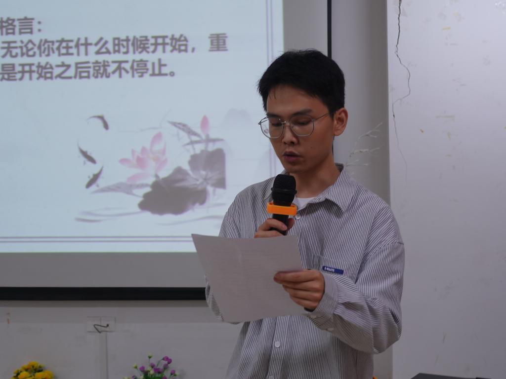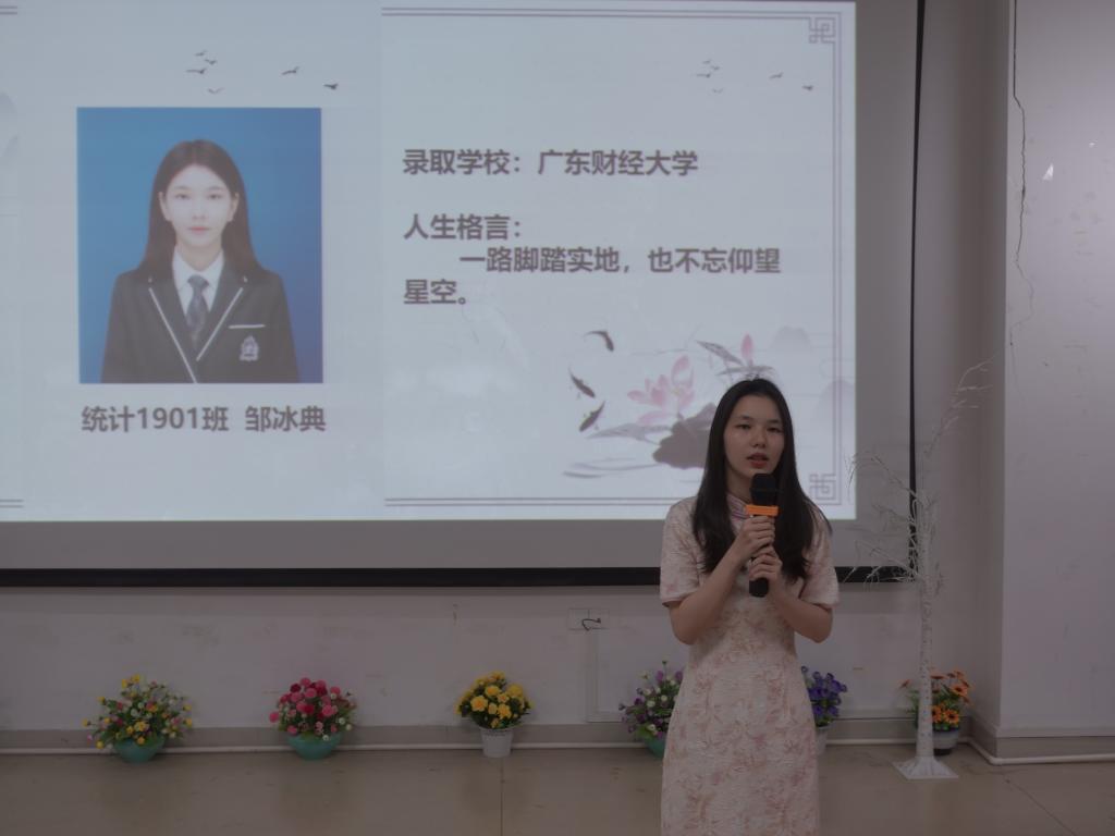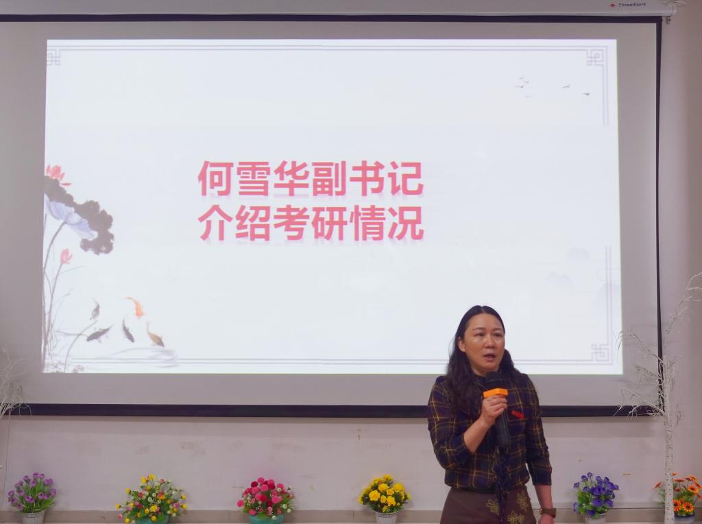 会上,两位成功考研的同学分享了经验。考取暨南大学的饶焕同学从择校与复习备考方面畅谈了做法。他强调,考研目标选择很重要,不能好高骛远,也不能妄自菲薄,要研究高校,主动对表;要建立良好心态,注重学习效率,科学分配时间,做到事半功倍。考取广东财经大学的邹冰典同学从复习备考方法上谈了体会,她强调考研一定要持之以恒,久久为功,要“拼得一身剐”,切不能有歇歇脚、松松劲的想法,要排好时间表,一张蓝图绘到底;要坚定信心,保持定力,稳打稳扎,惟实惟先,善作善成。