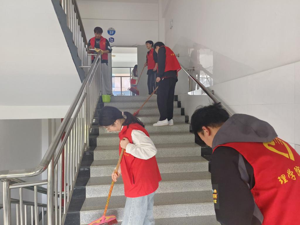 70余名青年学生、党员深入理院楼内、周边区域、前后草坪开展学院环境卫生精细化清理,清扫垃圾死角、清理“课桌涂鸦”、清除院内“牛皮癣”,擦亮门窗栏杆。他们分工合作,同心协力,用心灵发现美,用双手创造美,充分发挥了不怕苦、不怕累的劳动精神,通过双手,将理院楼打扮得更靓更美更宜人,为美丽校园建设贡献自己的一份力量。