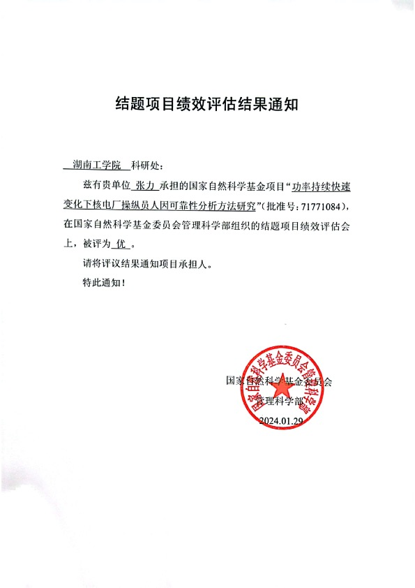 近日,学校科技处收到国家自然科学基金委员会管理科学部通知,best365官网张力教授承担的自然科学基金项目“功率持续快速变化下核电厂操纵员人因可靠性分析方法研究”(批准号:71771084),在国家自然科学基金委员会管理科学部组织的结题项目绩效评估会上,被评为“优”。