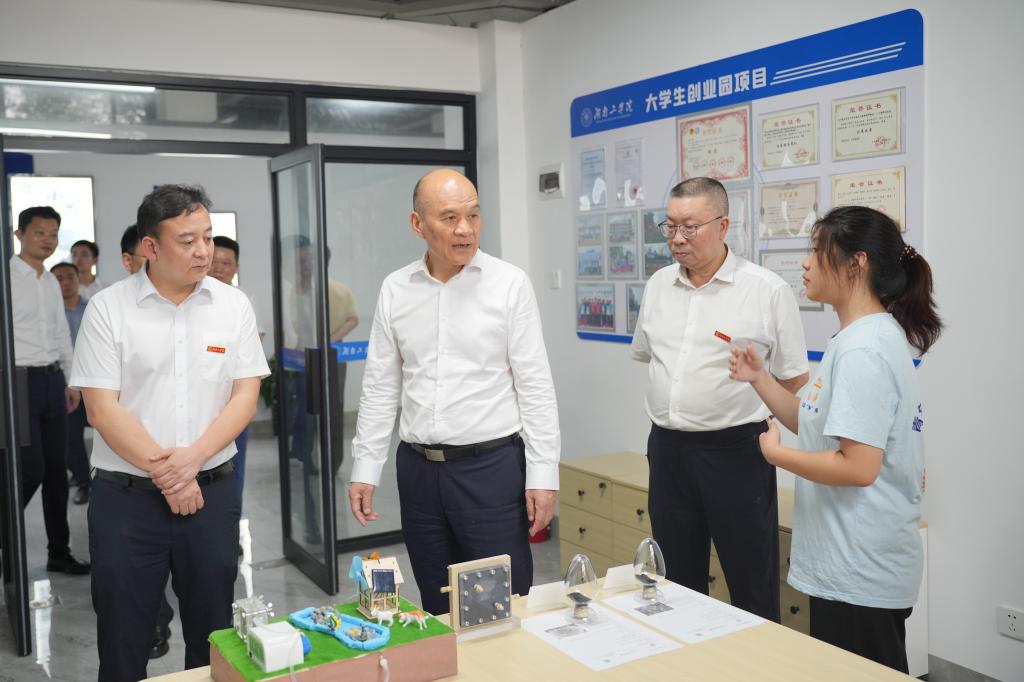 在大学生创业园,刘越高一行听取了学校办学特色,创新型、应用型人才培养情况,大学生创业园的基本情况,参观了园区各创业项目研发成果和产品应用情况,并与师生亲切交流。刘越高鼓励学校深化产教融合、校企合作,培养更多符合衡阳发展需要的高素质技能人才。