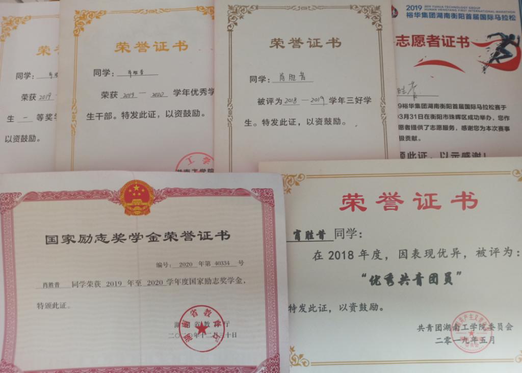 在校期间,获国家励志奖学金、校级一等奖学金、校级二等奖学金、校级三等奖学金、校三好学生、校优秀团员。