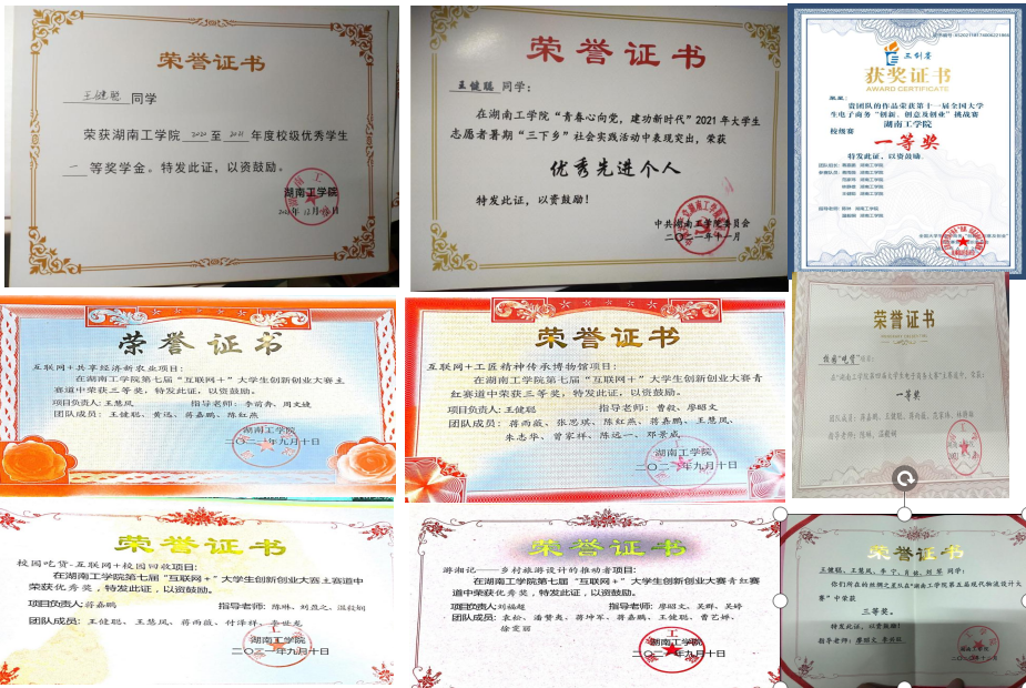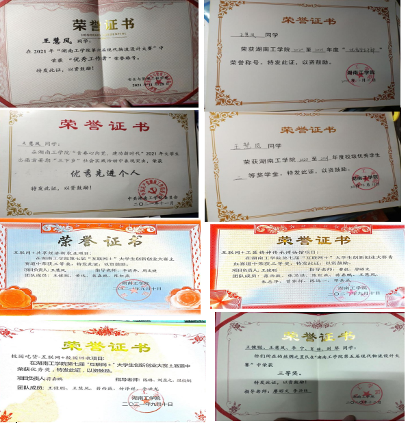 在校期间荣获国家励志奖学金、校一等奖学金、湖南省“三下乡”社会实践活动优秀服务团队、全国大学生电子商务创新创业挑战赛一等奖、第四届电子商务大赛一等奖、第六届挑战杯课外知识竞赛三等奖、物流设计大赛校三等奖、“三下乡”优秀先进个人、大创校级立项2项、三下乡校级立项4项、互联网+青红赛道校三等奖1项、校优秀奖2项、院一等奖2项、互联网+主赛道一等奖3项、三等奖2项、院三等奖1项、优秀奖1项。